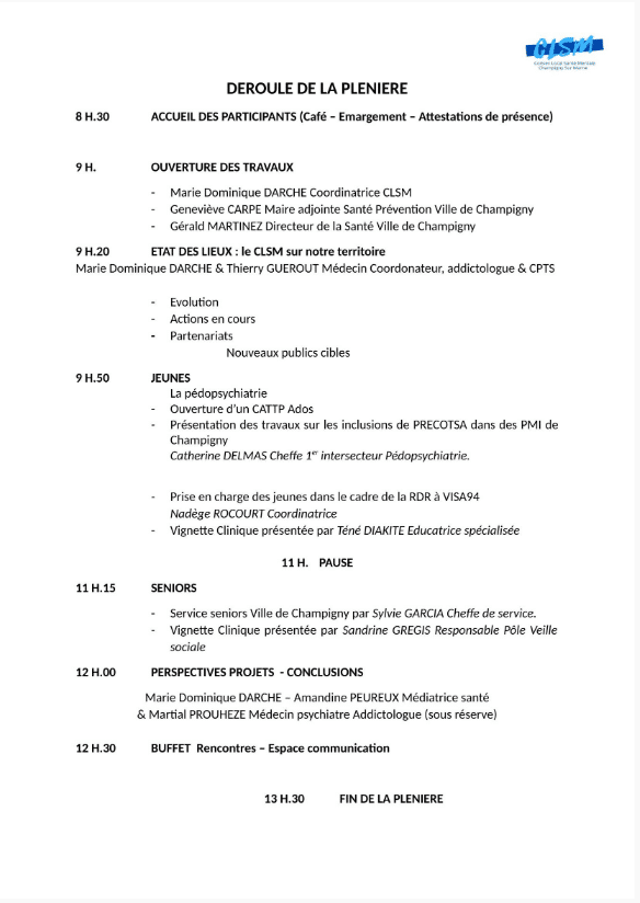 La gouvernance du CLSM comprend une assemblée plénière et le comité de pilotage (COPIL) présidés par le Maire de Champigny ou son représentant.